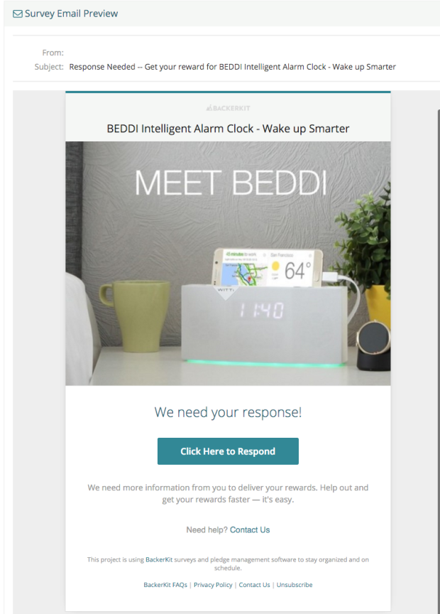 We will send out a backerkit survey soon. You will receive an email that look like the following picture. Please help to enter your BEDDI color choice, your wall plug info, and reconfirm your shipping address and telephone number. This survey should take only 1 minute or so, and you can always go back to change your color choice or address. This survey is much more flexible than Indiegogo survey system. So thank you for taking your time to do this.